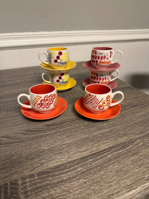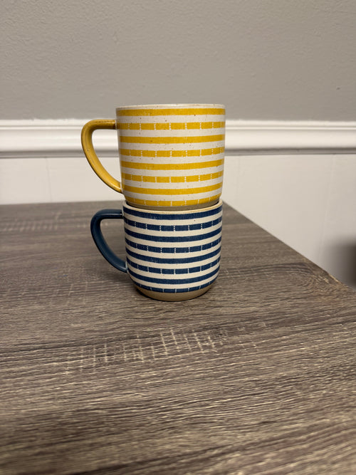 Hearth & Hand with Magnolia stoneware mugs featuring a clipped stripe pattern in blue and yellow hues